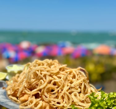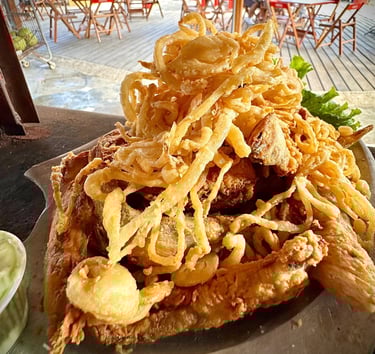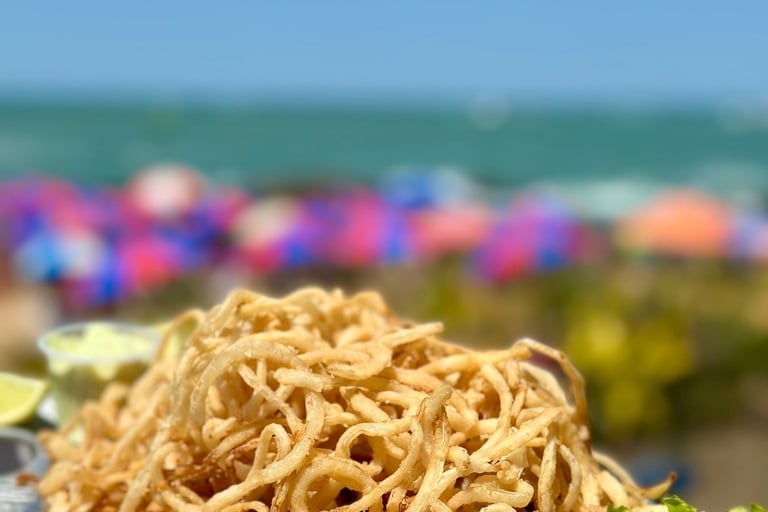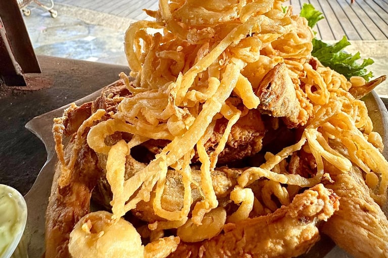 Isca de peixe, camarão à dorê, Lula à dorê, cebola